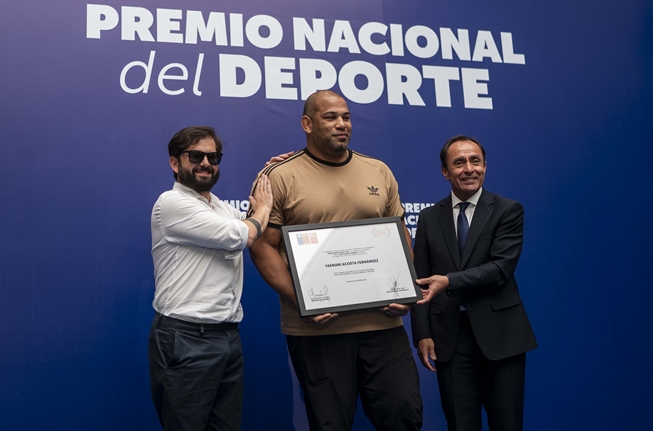 El Presidente de la República, Gabriel Boric Font, junto al ministro del Deporte, Jaime Pizarro; el ministro de Educación, Nicolás Cataldo; y la ministra de Salud, Ximena Aguilera, entregó el máximo reconocimiento estatal para deportistas a Yasmani Acosta, elegido como ganador del Premio en mayo de 2025 por una comisión definida por ley.